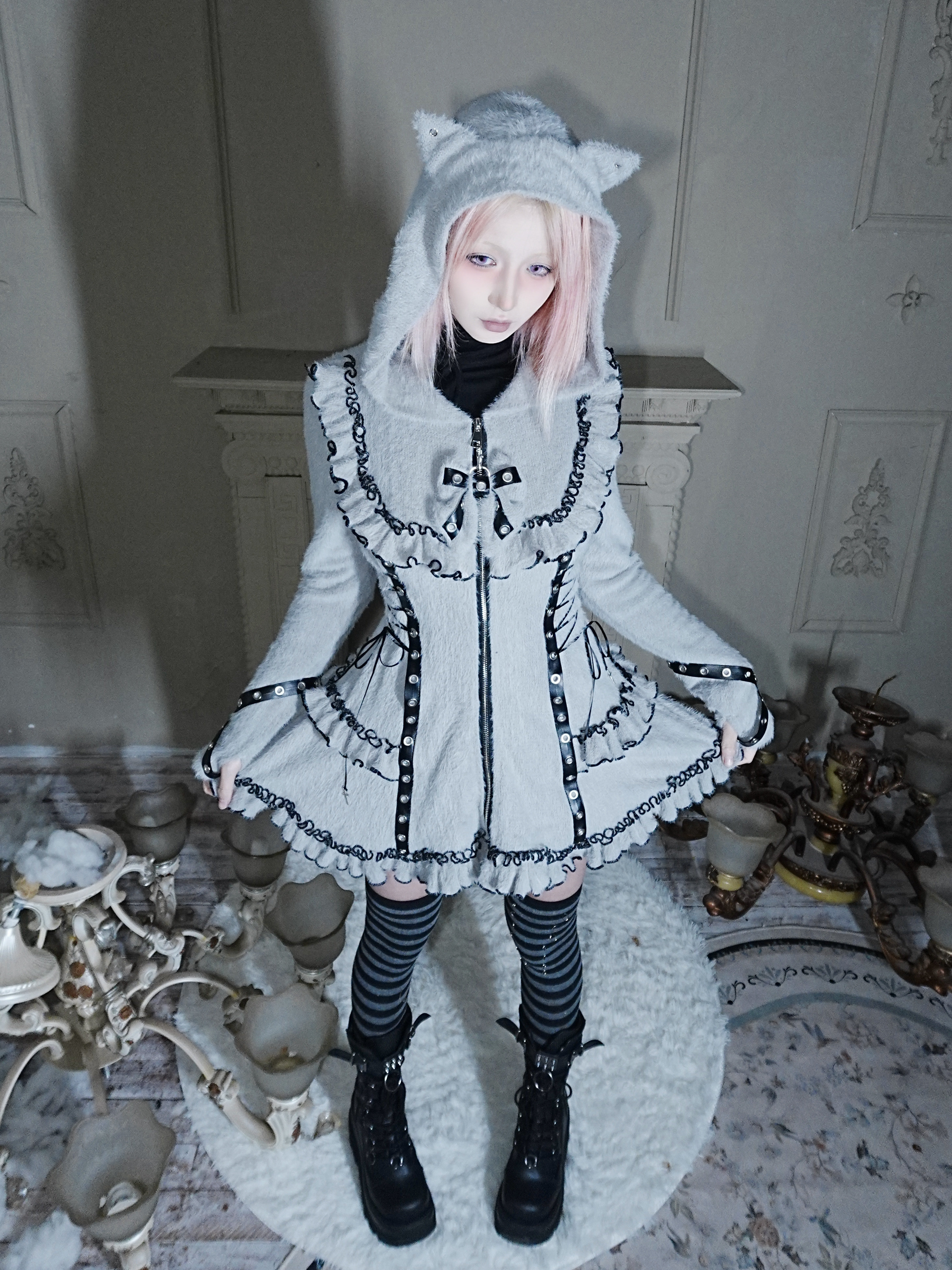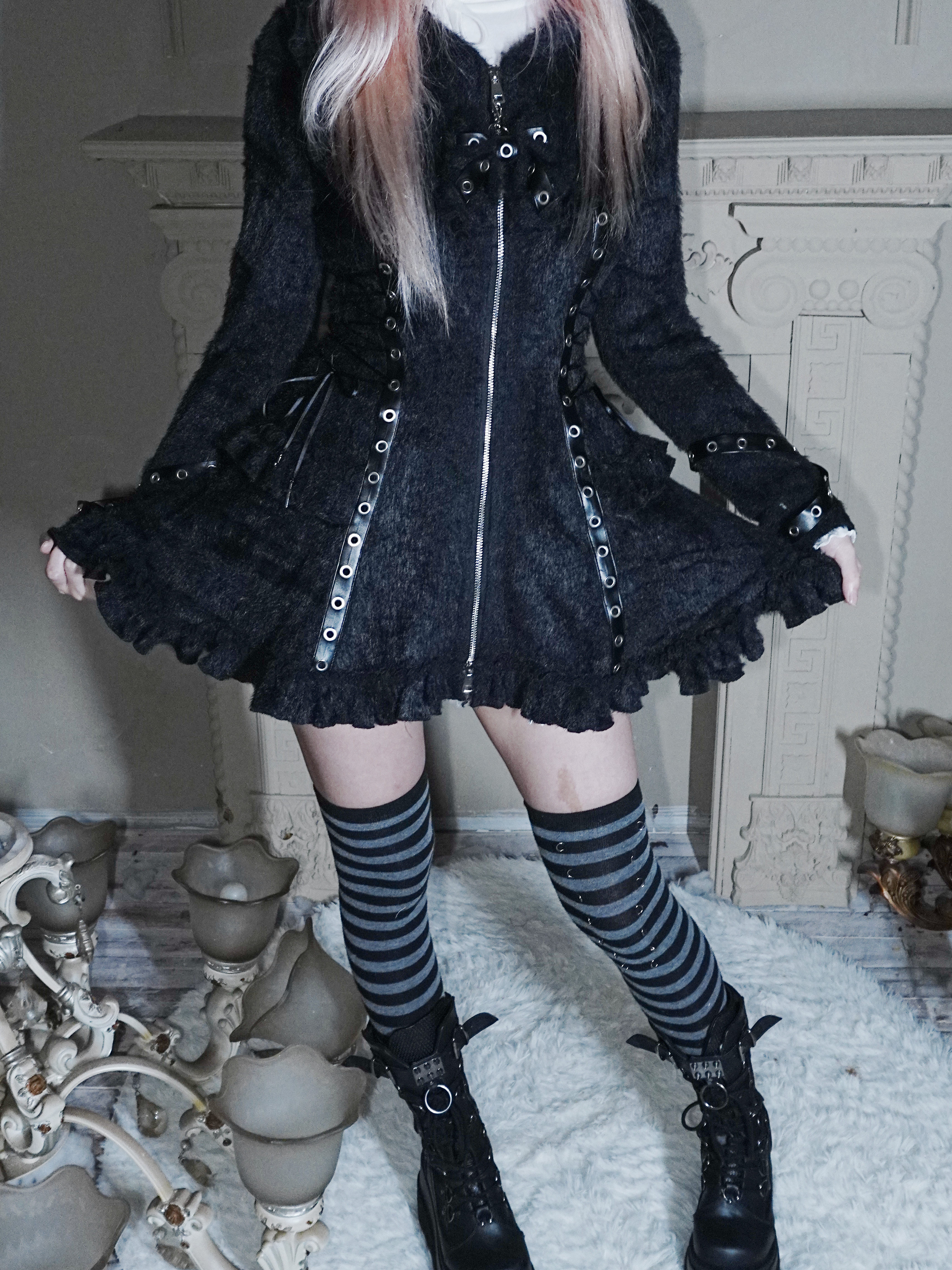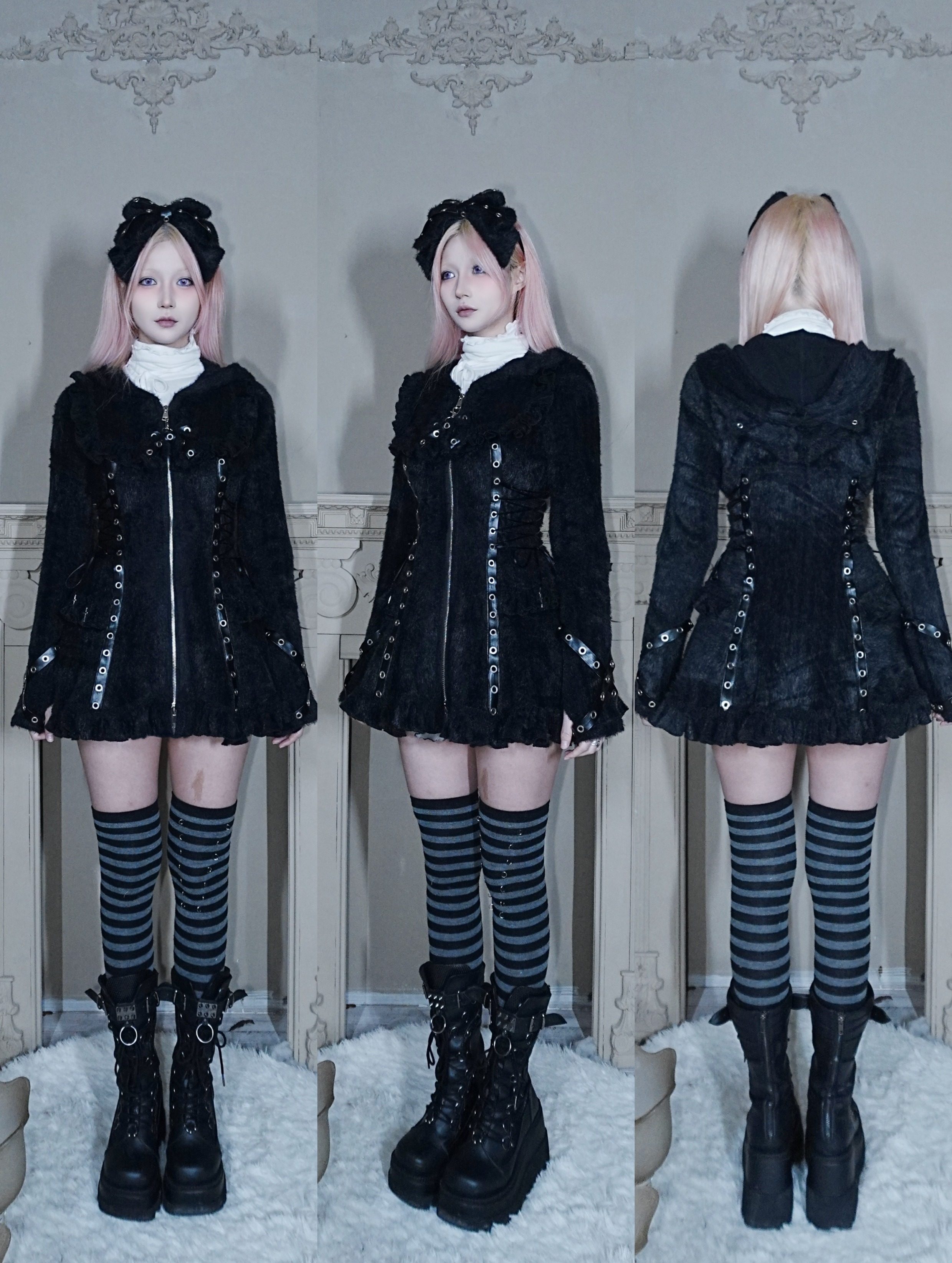 Fluffy Cat-Ear Hooded Dress - Black